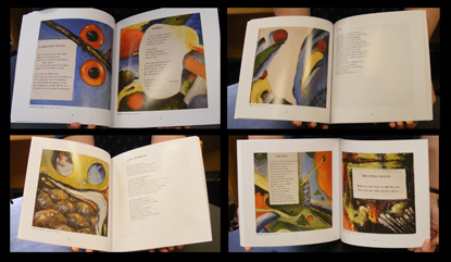 The above two poems appear opposite their paintings in Alternative Values. Others are part of the paintings. This picture shows the variety of poem and painting treatments in the book.