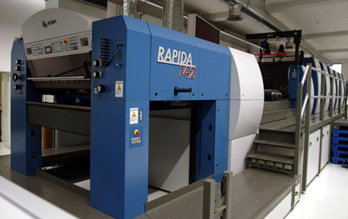 Bloodaxe titles are printed on a four-colour KBA Rapida 142 sheet-fed press used at Bell & Bain in Glasgow, one of the first of a new range of German-built hi-tech presses to be installed in Britain. This photo shows a six-colour press from the same series.